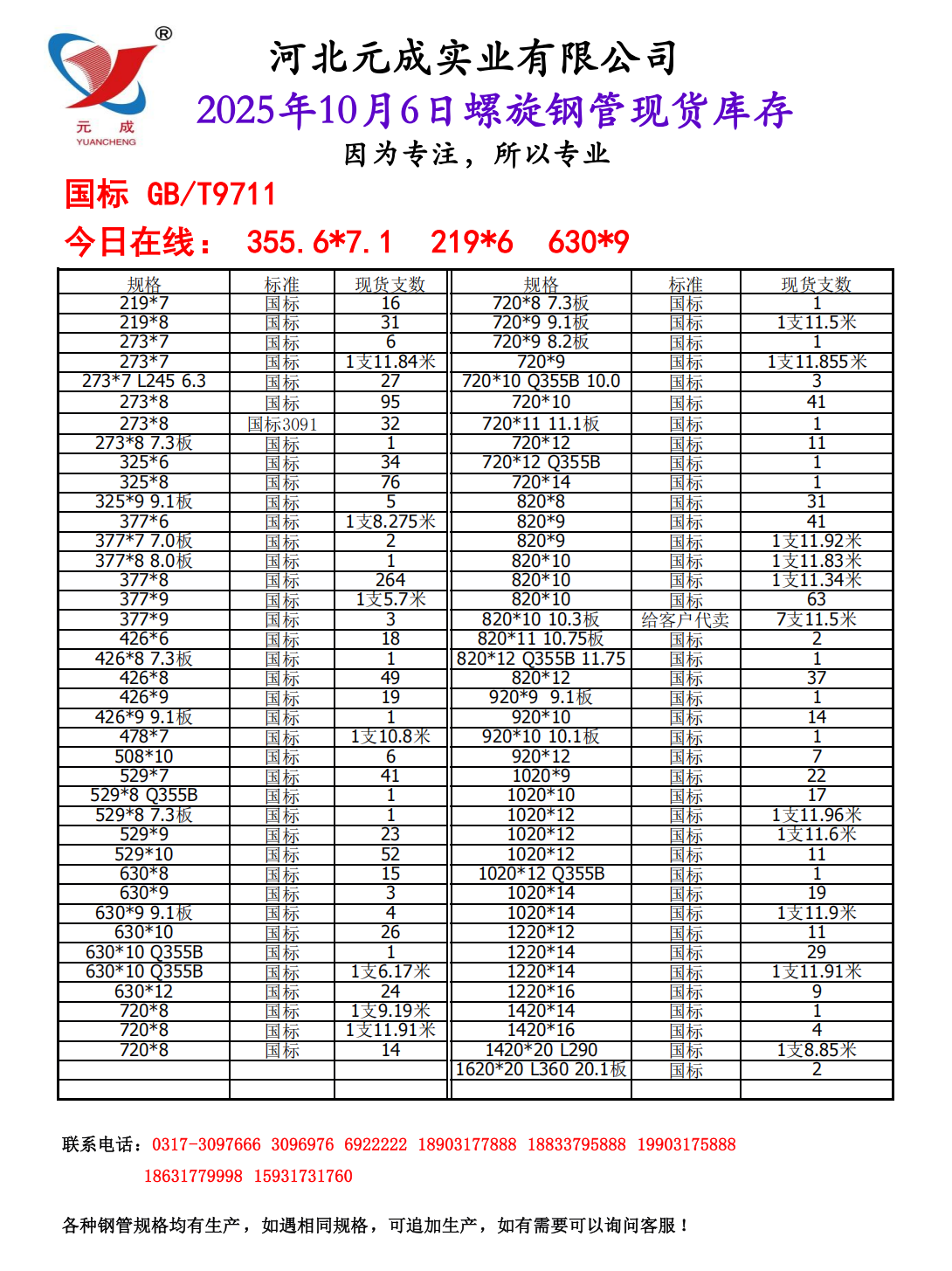 河北元成实业2025年10月6日国标螺旋钢管现货库存
