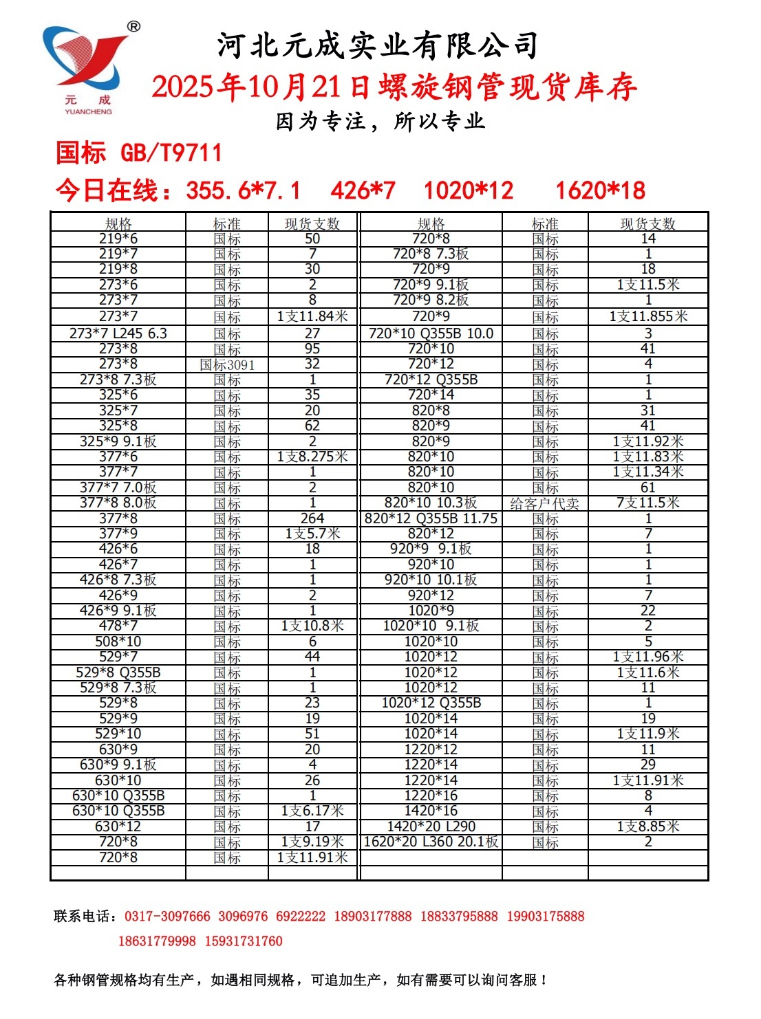 河北元成实业2025年10月21日国标螺旋钢管现货库存
