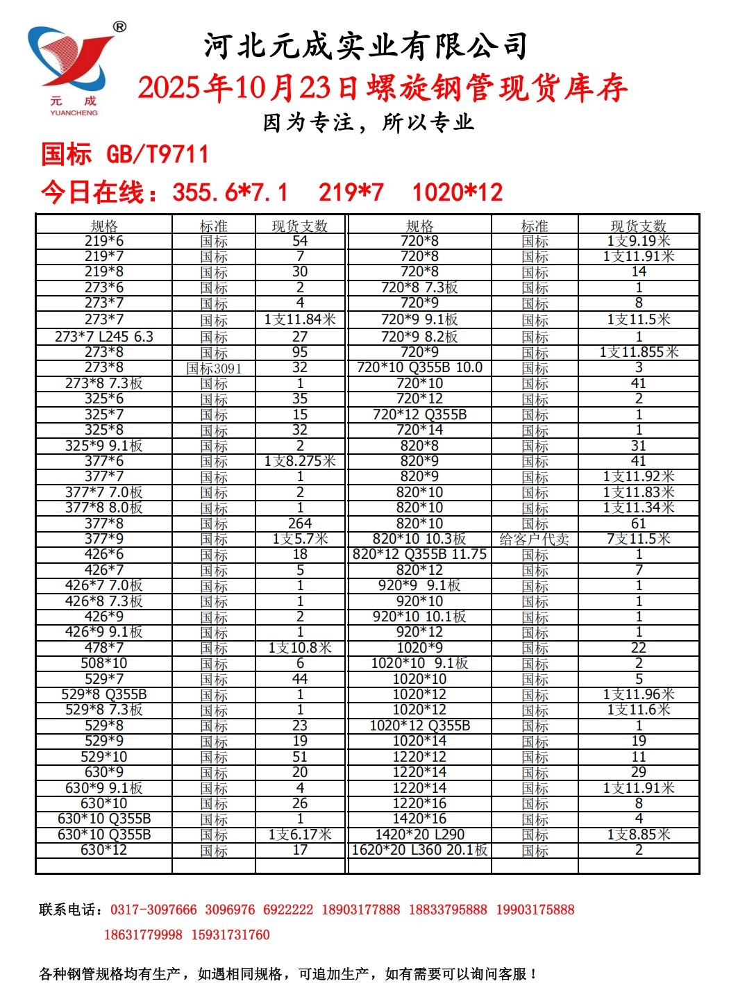 河北元成实业2025年10月23日国标螺旋钢管现货库存