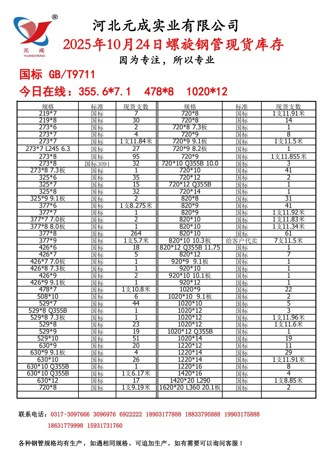 河北元成实业2025年10月24日国标螺旋钢管现货库存